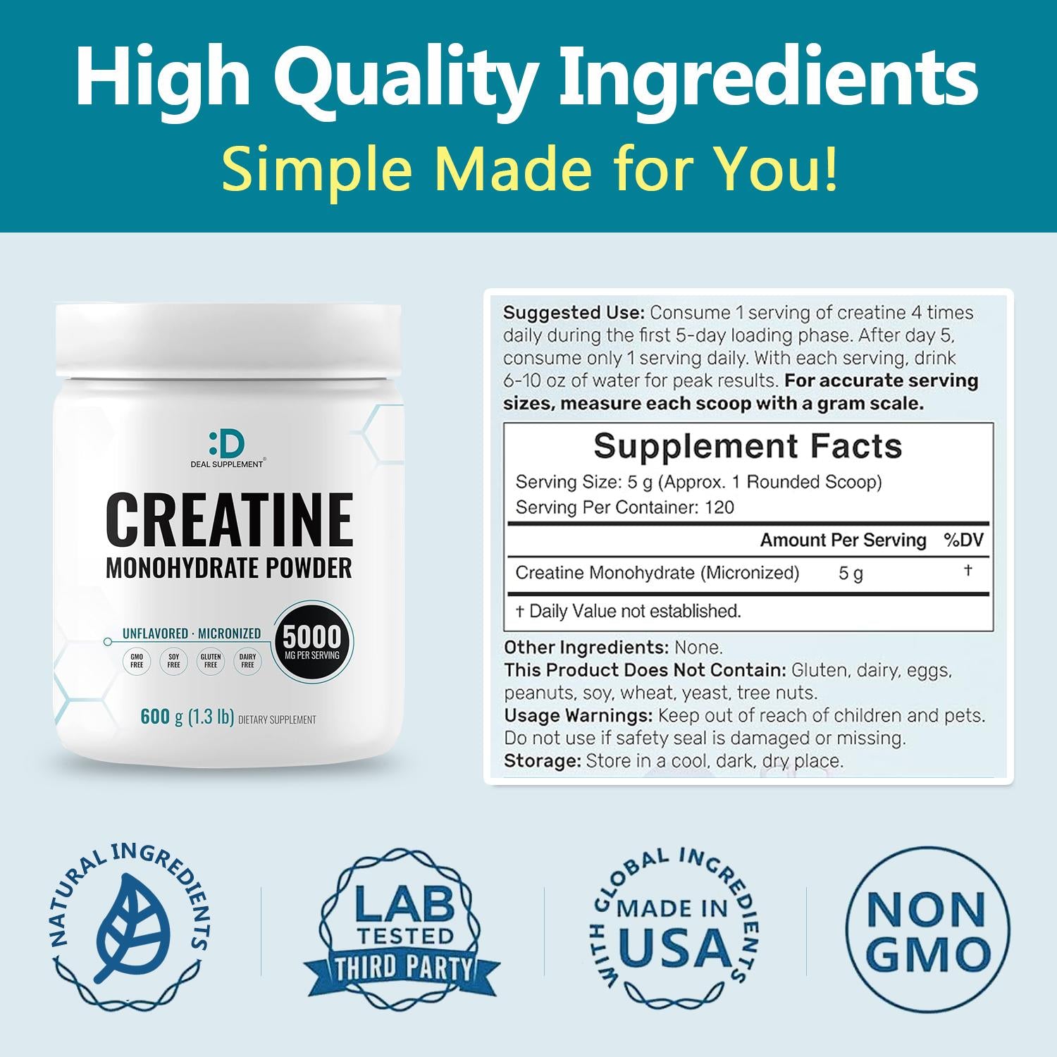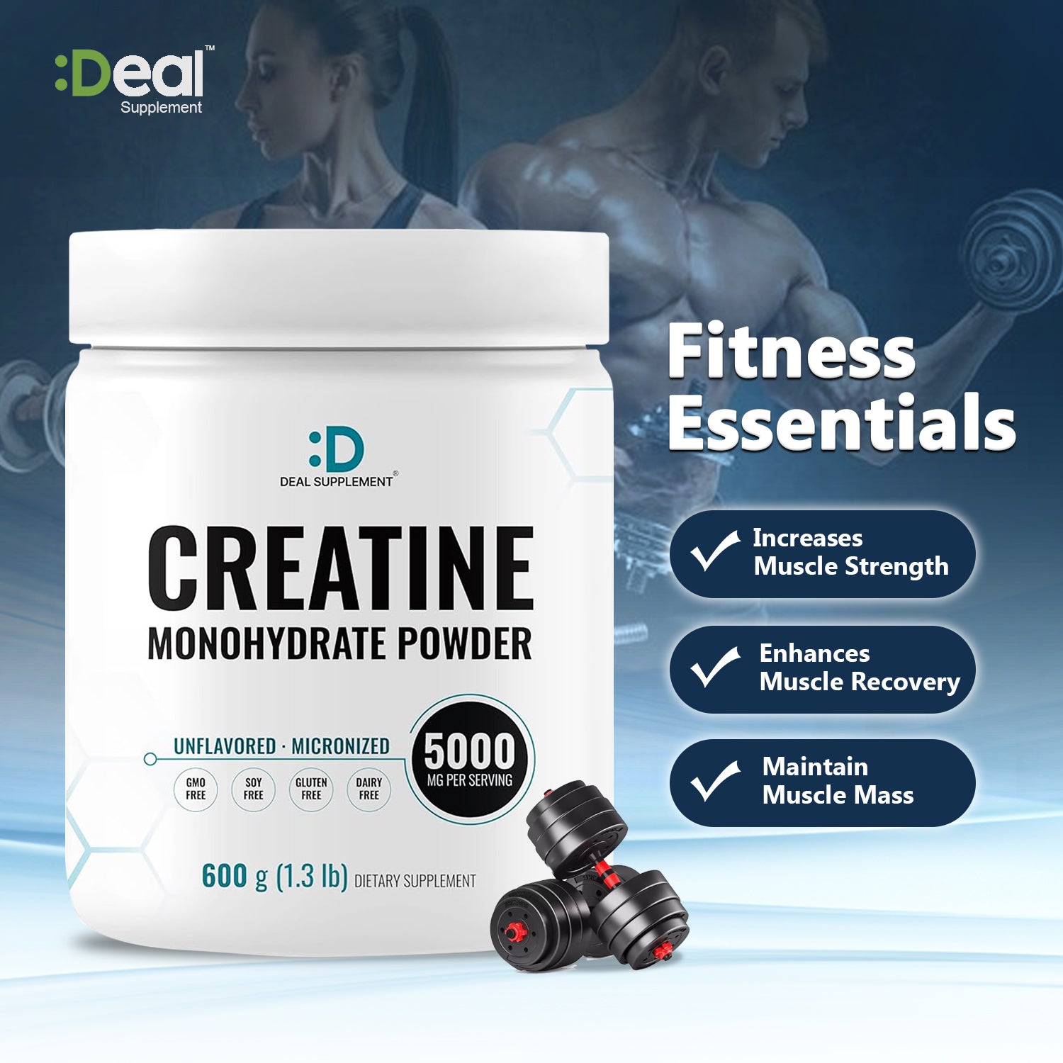 - The most efficient monohydrate form that supports muscle contractions, energy production, and lean muscle mass maintenance. Deal Supplement’s creatine jar offers 600g of this powerful performance supplement with 120 servings of a 5000mg dose. The micronized particles are broken down into a fine powder so you can mix it or combine it with other workout supplements for top level training.